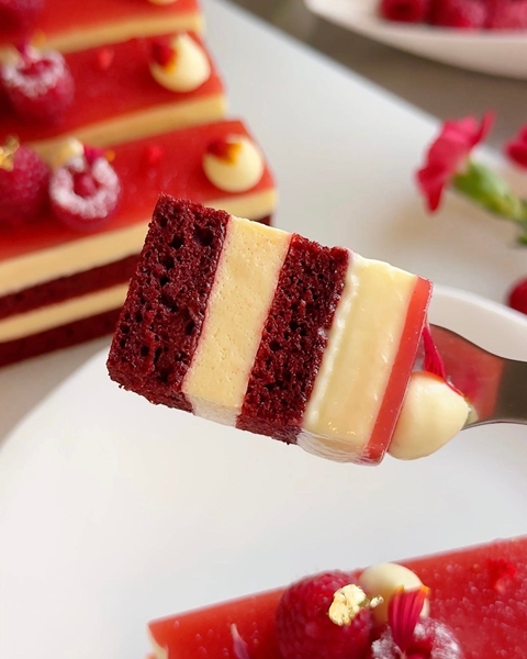 Yumuşak ve nemli red velvet pandispanya, vanilyalı Bavarian krem ve krem peynirli çırpılmış ganaj katmanlarıyla hazırlanır ve üstü parlak ahududu glaze ile tamamlanır. Kremamsı, hafif ekşimsi ve meyvemsi bir dokunuşa sahip — klasik red velvet pastaya zarif ve renkli bir yorum.