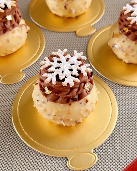 Yumuşak çikolatalı-bademli pandispanya tabanı, ince bir badem feuilletine crunch, ipeksi baharatlı çikolata-kahve crémeux, ve hafif baharatlı badem bavarois katmanlarından oluşan bir tatlı. Her biri ince bir beyaz Rocher glaze ile kaplanır ve üstüne çikolatalı badem çırpılmış ganaj fırfırları, parlak kahveli karamel havuzu ve narin bir kar tanesi tuile ile tamamlanır.