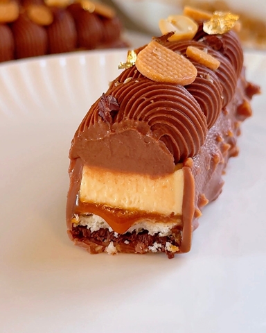 Çikolatalı feuilletine, dacquoise, tuzlu karamel, fıstık ezmesi moussu, çikolatalı çırpılmış ganaj ve rocher glaze ile hazırlanmış bir tatlı.