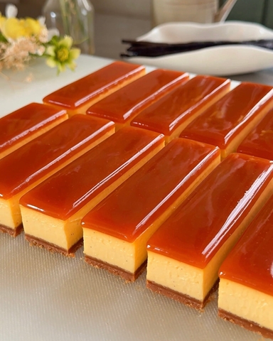 Crème brûlée’den ilham alan, parlak karamelli bir glaze ile tamamlanan vanilyalı muhallebi tart.