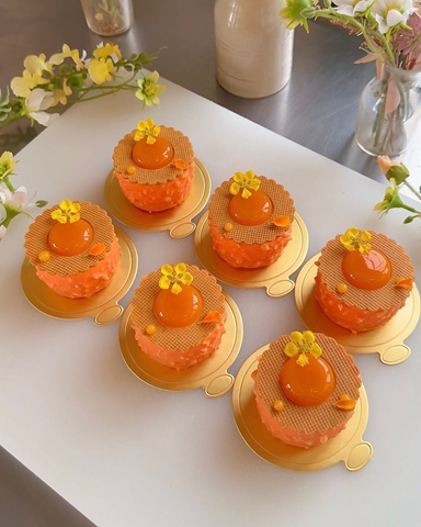 Makademya financier, makademya beyaz çikolata crunch, kayısı confit, ve portakal aromalı vanilyalı çırpılmış ganaj ile hazırlanan parlak ve ferah bir kayısı entremet pastası.