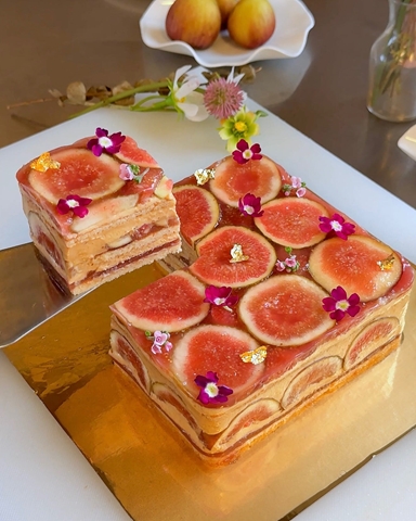 Bal aromalı joconde pandispanya, incir-ahududu kompostosu, ceviz pralin çırpılmış ganajı ve taze incirler ile hazırlanan; parlak meyve glazesi ile tamamlanan bir pasta.