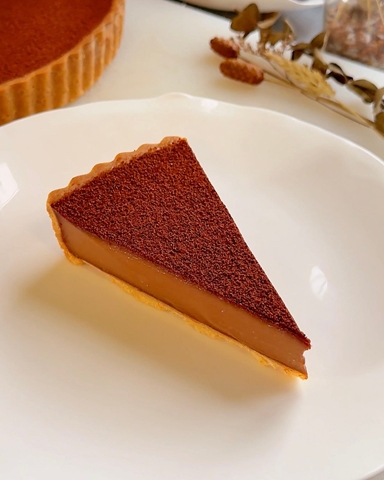 Tonka fasulyesi ile aromalandırılmış ve öğütülmüş kakao nibleri ile tamamlanan kremamsı çikolatalı custard tart.