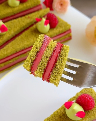 Yumuşak matcha pandispanya, ekşimsi ahududu confit, ipeksi ahududu crémeux ve matcha çırpılmış ganaj katmanlarından oluşan bir pasta